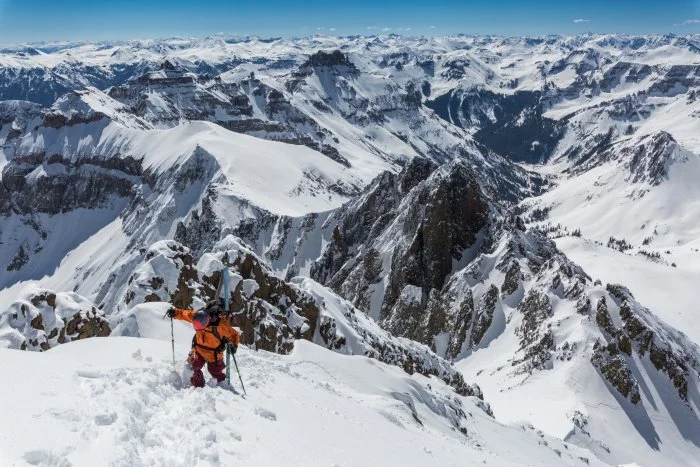 Returning to the truck after skiing the Snake required a 1,600 ft climb out of Blaine Basin to Lavender Col, and eventually dropping back into Yankee Boy. Fortunately the views kept us motivated. Skier: Sven Brunso, Location: Mt Sneffles (14,157' ), San Juan Mountains, CO.